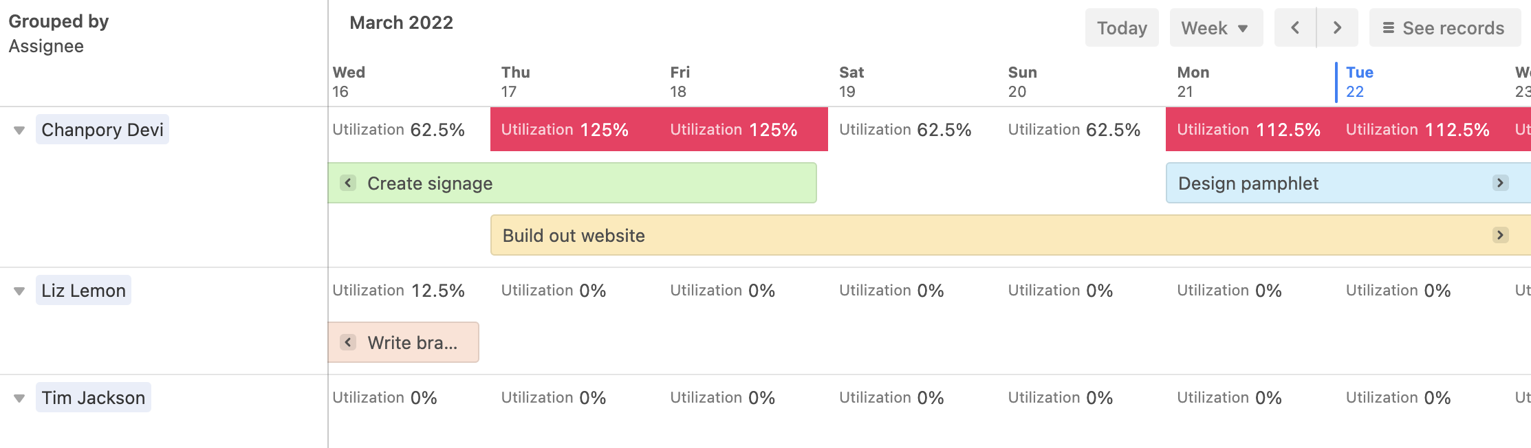 You can also make resource allocation easier to understand with grouping. Grouping lets you make quick and distinct associations between multiple records, and can help you visualize how projects are being resourced.