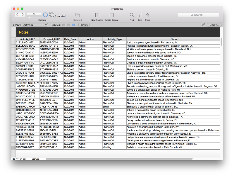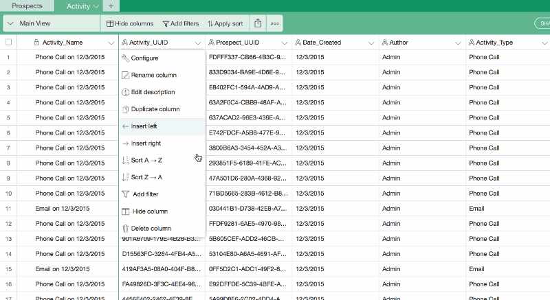 You might also want to hide some of the columns that aren’t necessary for this view, including Activity_UUID, Prospect_UUID, and Author.