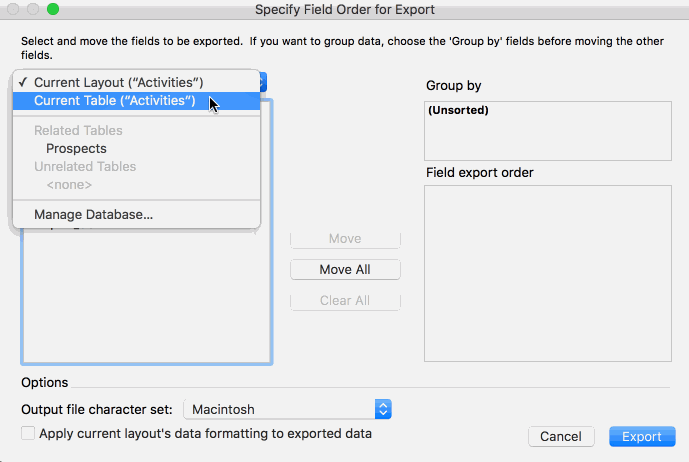 You also want to export the “Full_Name” field from the Prospects table. (You’ll use the “Full_Name” field to re-establish the relationships between the Activity and Prospects table in Airtable.) To select that field, select Prospects from the drop-down menu, locate the field in the list, and either double-click it or click the “Move” button to add it to the list of fields that are to be exported.