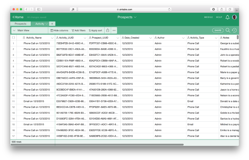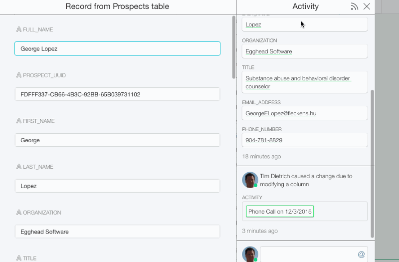 Here’s what happened: Airtable took the values in the Full_Name column from the Activity table, and matched them to the corresponding records in the Prospects table. Behind the scenes, those relationships are using Airtable’s “real” record IDs. So if you change a prospect’s name, the relationship to records in the Activity table will be maintained.