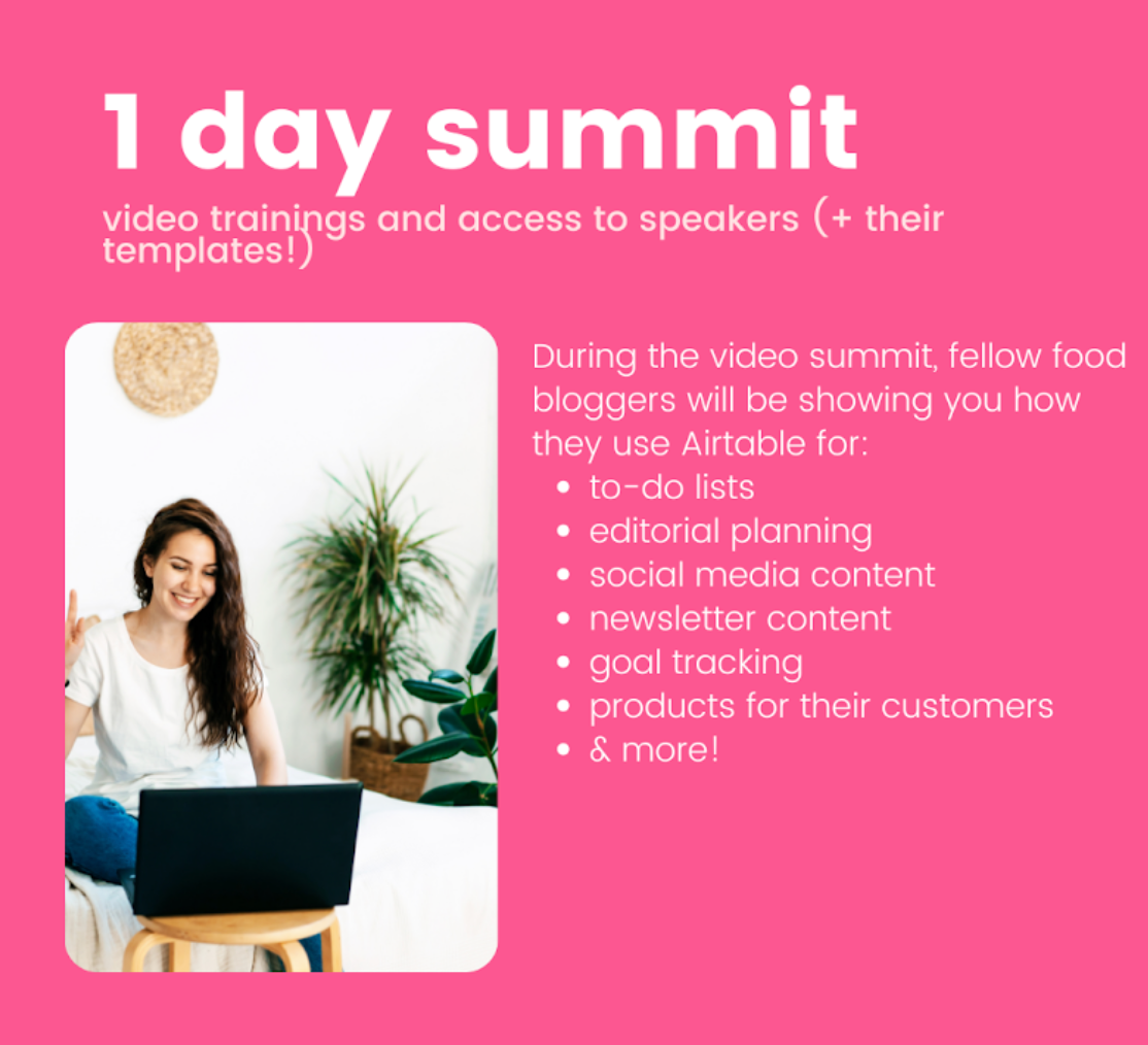 Now she’s dropped all the other tools and is a self-described “Airtable fanatic.” This week she’s leading her first Airtable for Food Bloggers Summit, where Cole, a co-host, and eight speakers will teach Airtable lessons on content creation—including editorial planning, newsletter building, goal-tracking, and more.