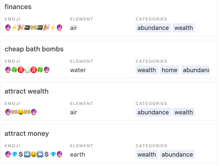 While some stretches in life seem smooth, others call for a handy Airtable collection of spells that you can cast using only emoji. (User Karla Alice Renée also tracked pagan holidays and phases of the moon.)