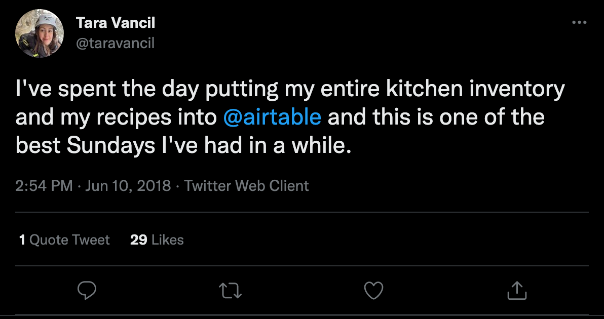 But you don’t need a one-of-a-kind collection to put Airtable to work in the kitchen. Programmer Tara Vancil inventoried her fridge, kitchen, and recipes, and she walks you through the complete base-building process here.
