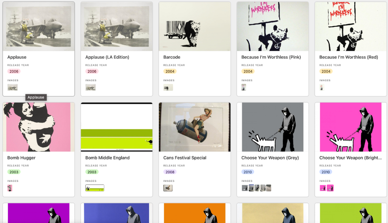 Have a particular bailiwick in art? Alex Andrews aims to list every piece that elusive street artist Banksy ever created. His Artery - The Banksy Database includes an impressive array of prints and originals.