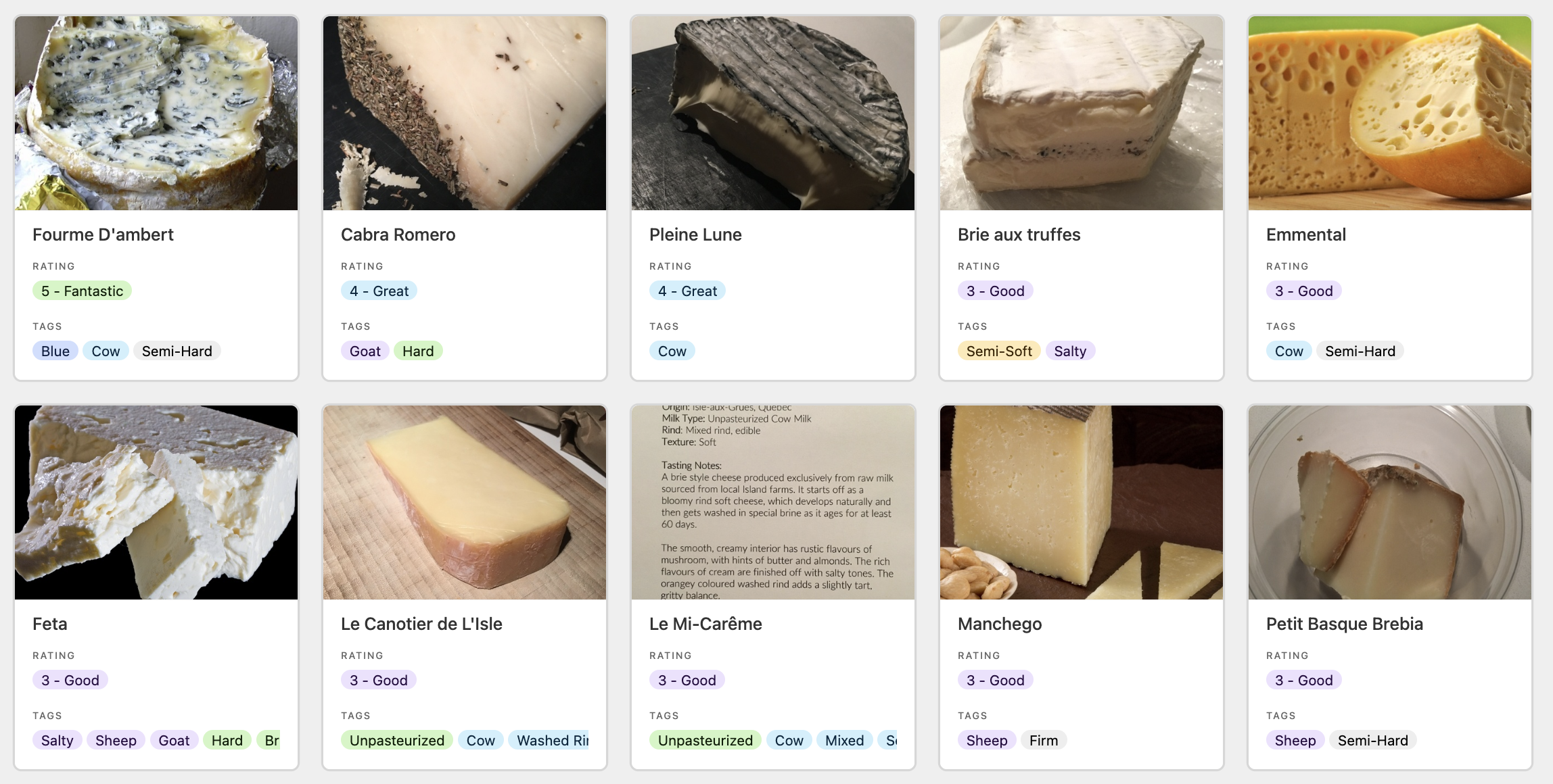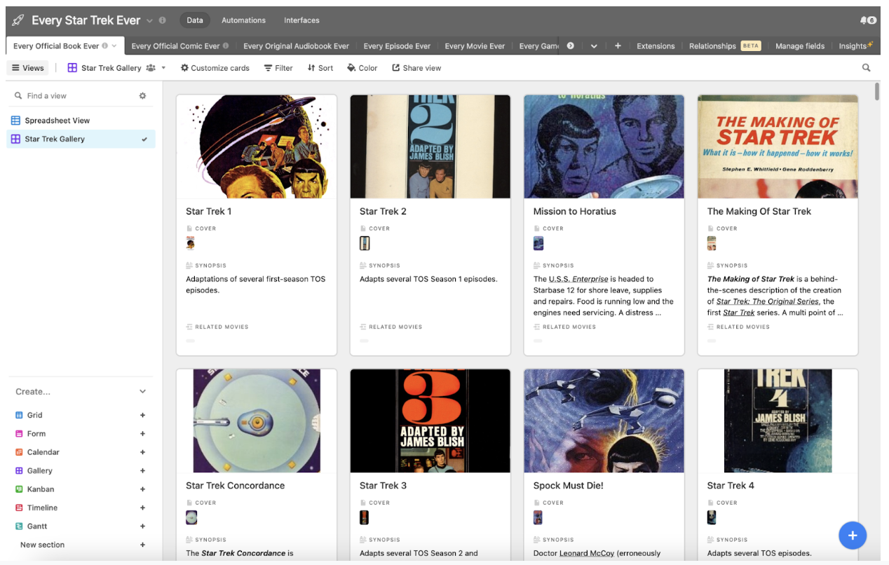 Airtable turns into a particularly practical book tracker. You can add records to a base while wandering through the antique bookstore and then see a collection of covers (or pages, or whatever else you’re tracking) in various views.