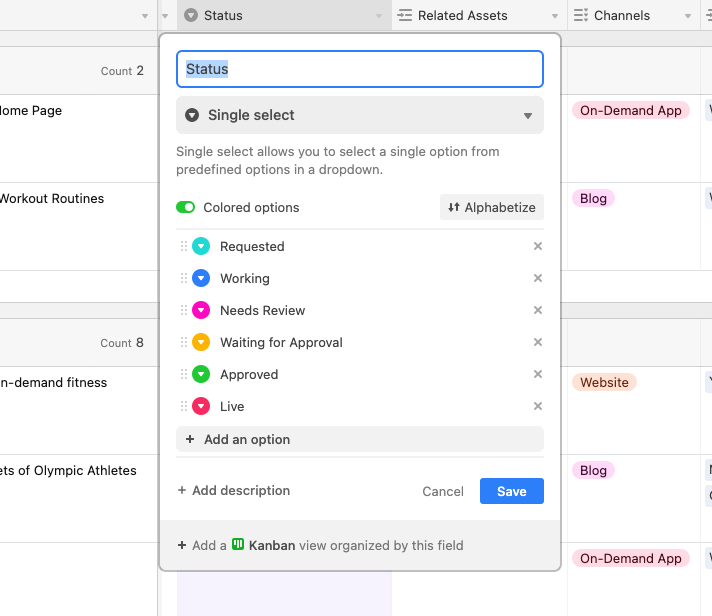 An easy way to let collaborators know when a record is ready for approval is by adding a single select field to your base, so you can denote the status of each record (ex. In writing, ready for review, approved, etc.) When a record is changed to “ready for review,” for example, this lets reviewers know it’s time to jump in. Add a collaborator field to your base so you can assign an approver to each record.