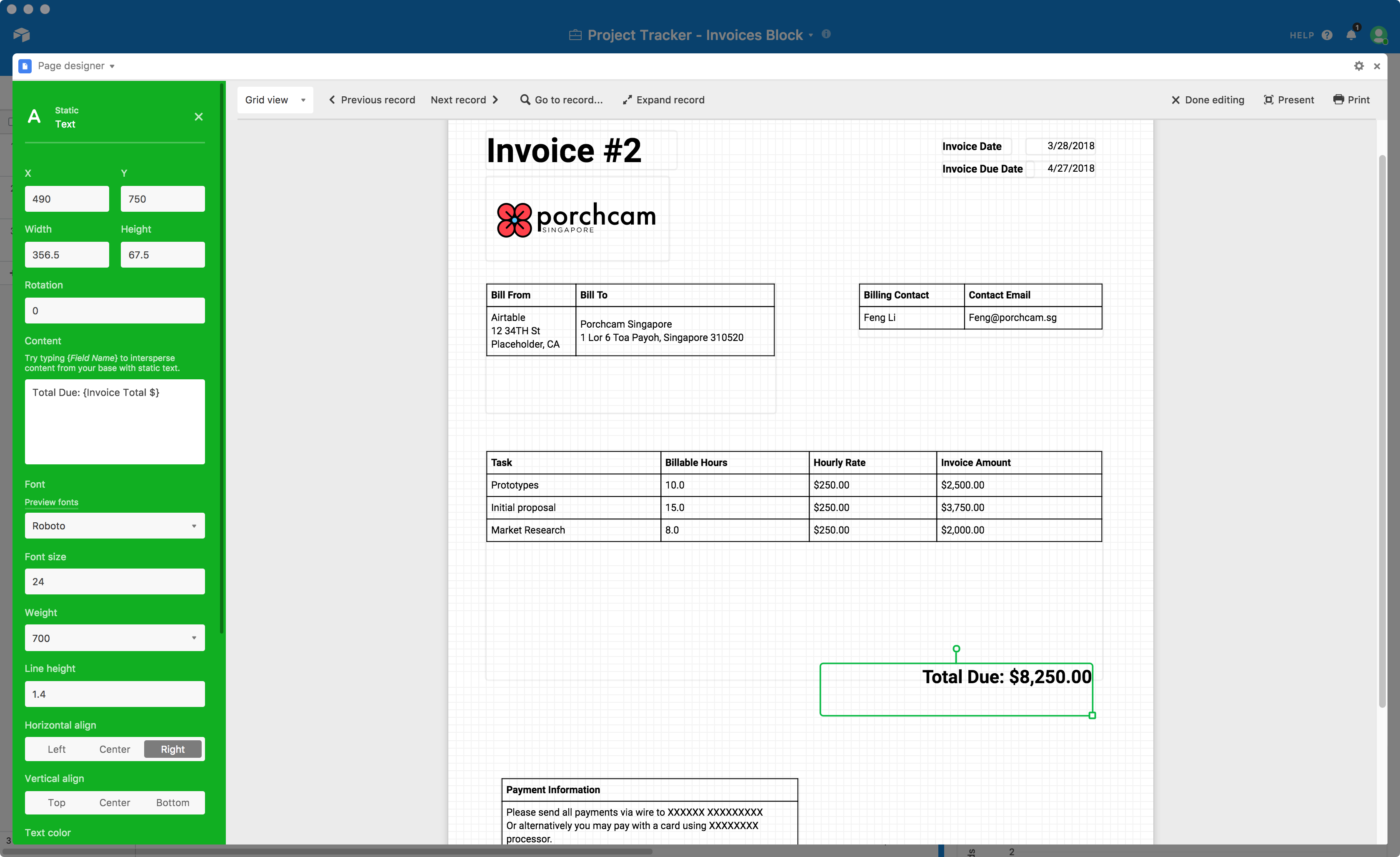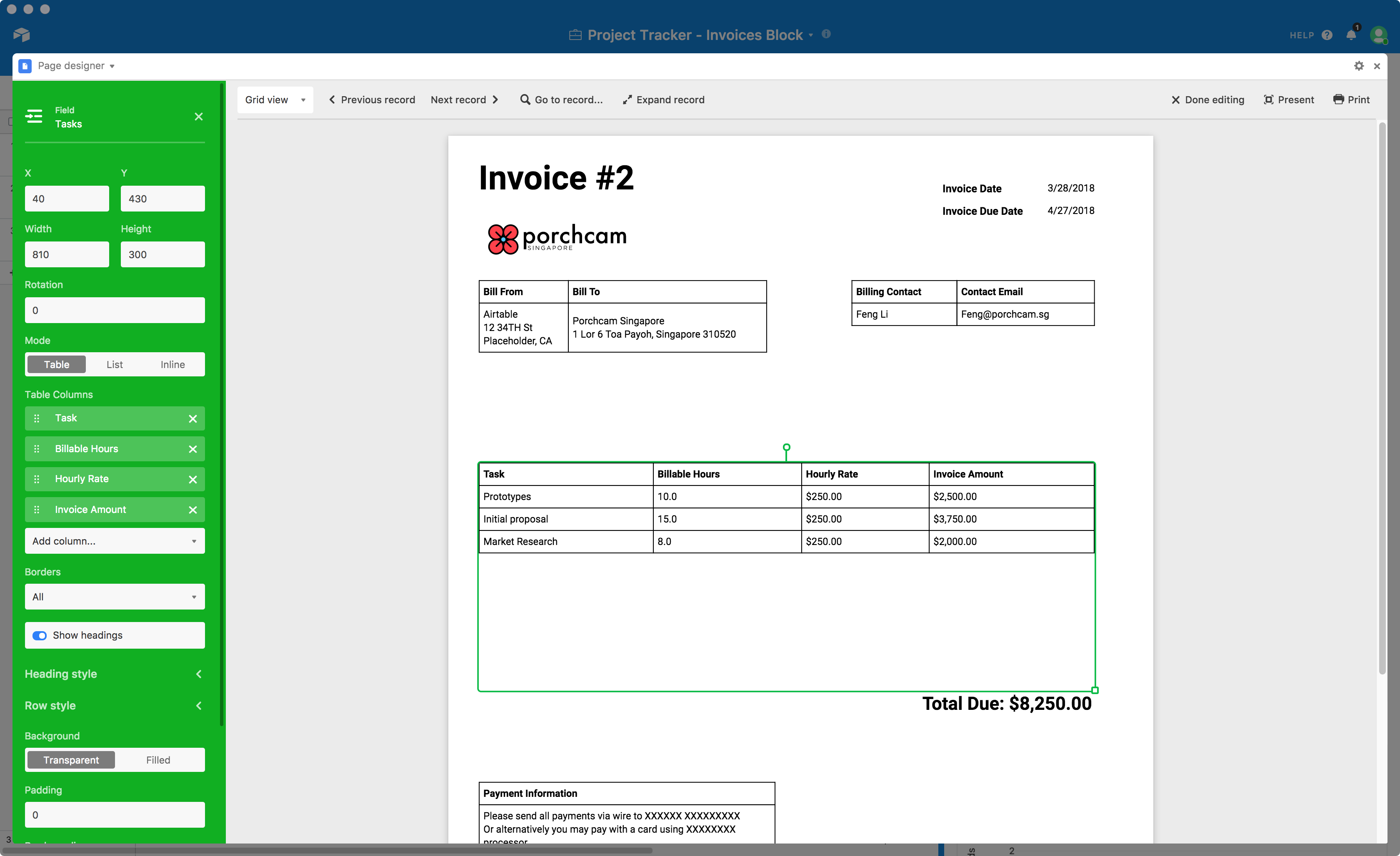In the image above you can see what it all looks like in a complete invoice template. In the following sections, we'll walk through the modifications to the Project Tracker base, and then each step of laying out the invoice template using the page designer block. We've also included a sample base with all of the modifications already made, which you can import into your own workspace and start using if you'd like to skip right to making the Page designer invoice template.