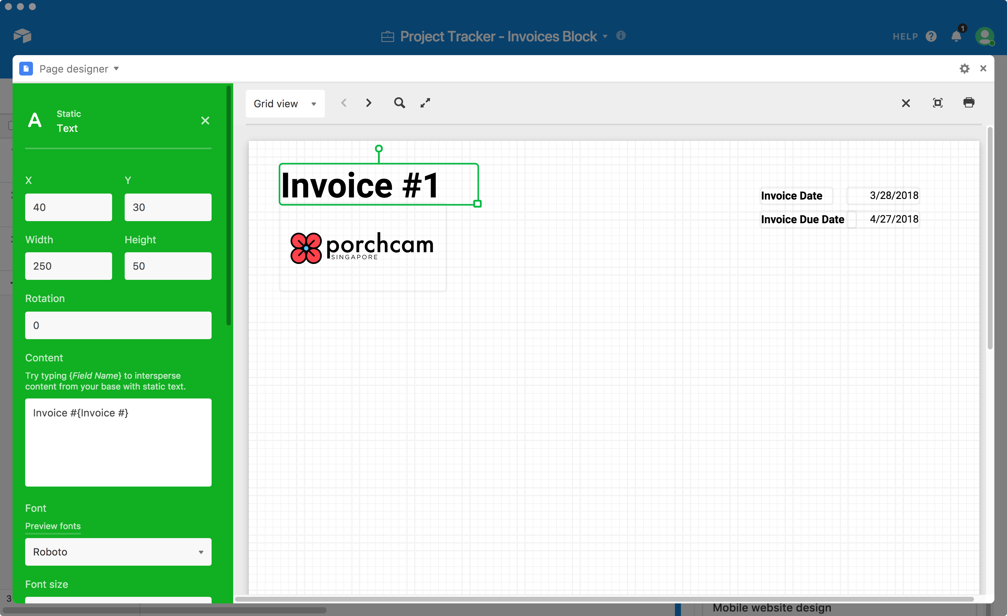 To start, choose Text under Static elements and make a large box on the top left of the page for your header. Give the font a nice big size and weight, and in the content, you can reference the Invoice number field by putting this in the content field: "Invoice #{Invoice #}". Below that box you can place the Logo field to insert the logo from your Clients records. To the right, place two static text objects in bold: "Invoice Date" and "Due Date". Next to these objects you can place the corresponding date fields in regular text, and use the Page designer's grid to line it up with horizontal text alignment set to Right.