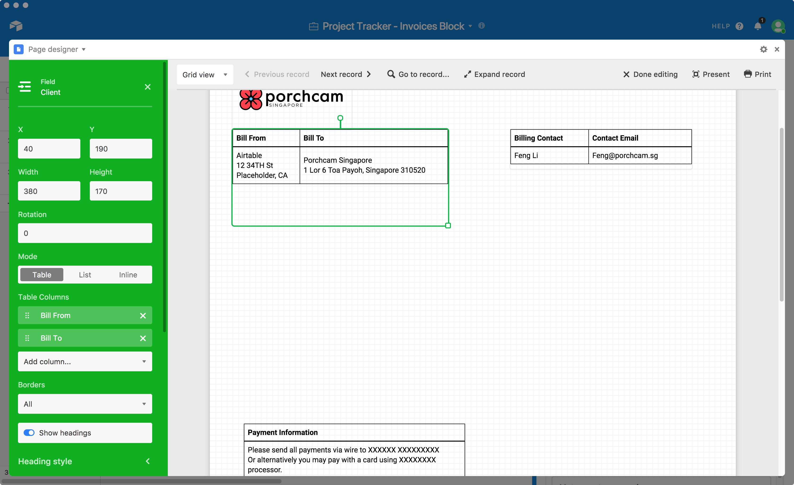 Now things are going to get a bit fancier. Choose Client from your fields, and then under Table Columns, add the Bill From and Bill To fields and remove the unnecessary Client field. You'll see that Airtable has looked up the fields on the linked Client record, without you having to explicitly include a lookup in the Invoices table. Drag the box to a bigger size to fit all the information. We'll use the same trick two more times for other client info. To the right of the billing info, you can place a Client table element with the Billing Contact and Email fields as columns; and then in the bottom left you can place a nice big Client table with just the Payment Information column.