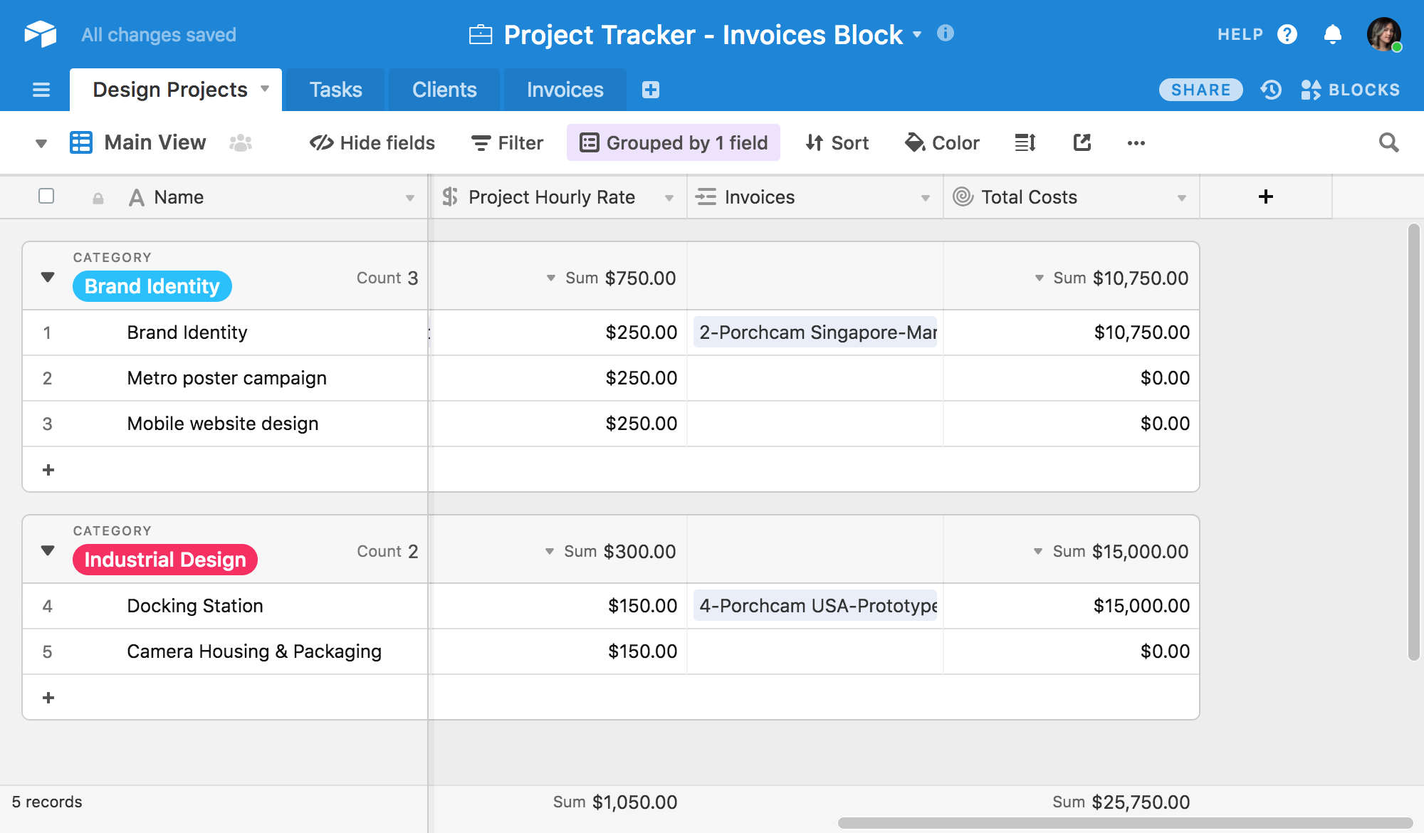 Project and task tracking are crucial for all businesses, so it's no surprise that the Project Tracker template is one of our most popular starting points for users building their own bases. We're going to modify the original Project Tracker template to add billing information fields to the records in the Clients table, hourly rate information to the records in the Projects table, and billable hours information to the records in the Tasks table. To link it all together, we'll create a new table for Invoice records, linked to one project, one client, and multiple tasks. As completed task records get added to an Invoice for billing, their costs will be calculated based on the rate and hours—and then, these completed tasks will be added as line items in the page designer invoice template.