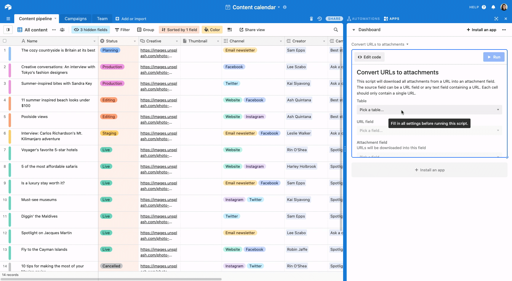 Want to explore our full library of script templates? Our scripts marketplace has even more pre-made scripts to choose from: like a value randomizer, importing YouTube analytics, converting URLs to attachments, and many more. Visit the scripts marketplace here.