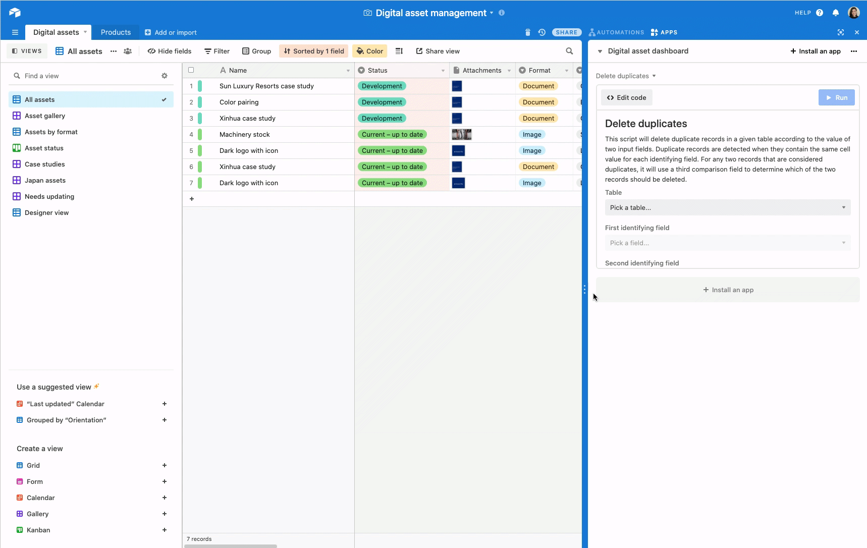 If you’re using your base as an organizational source of truth for unique sets of information—like a digital asset management tool (DAM), a customer feedback tracker, or a bug tracker—duplicate records can get confusing quickly. The delete duplicates script helps identify and remove records based on your field of choice.