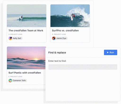 This works similarly to the find and replace function you might already use in your favorite word processing app. It locates, and then swaps out all text matches for a text field of your choice. It works well for modifying large sets of text information at once, like rebrands, product renaming, messaging refreshes, and the like.