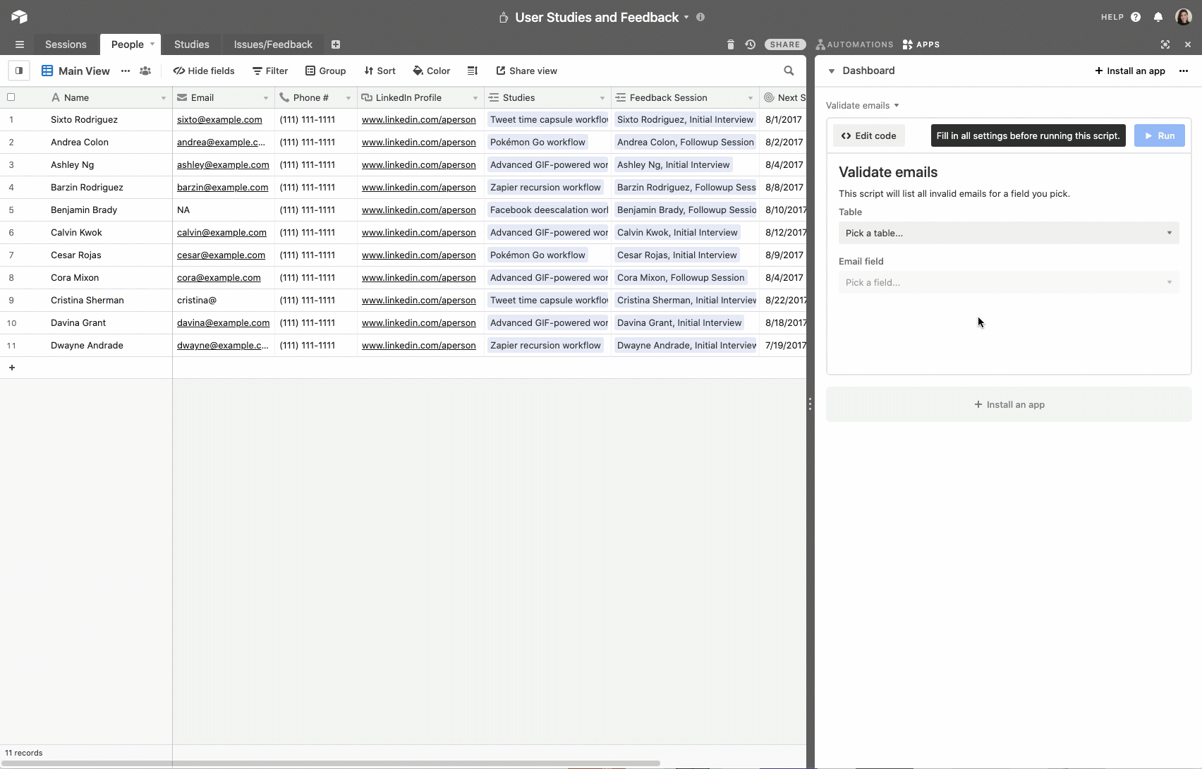 Scripts can help you work more efficiently by automating repetitive tasks. But you don’t need to be a developer to unlock the powers of scripting. Our scripting templates can help you automate common tasks within your base—from deleting duplicate records, to email validation.