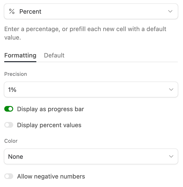The simplest way to set this up is with the percent field type. All you have to do is click the first toggle to turn your percentages into progress bars. Click the second toggle if you want to see the percentage number, too.