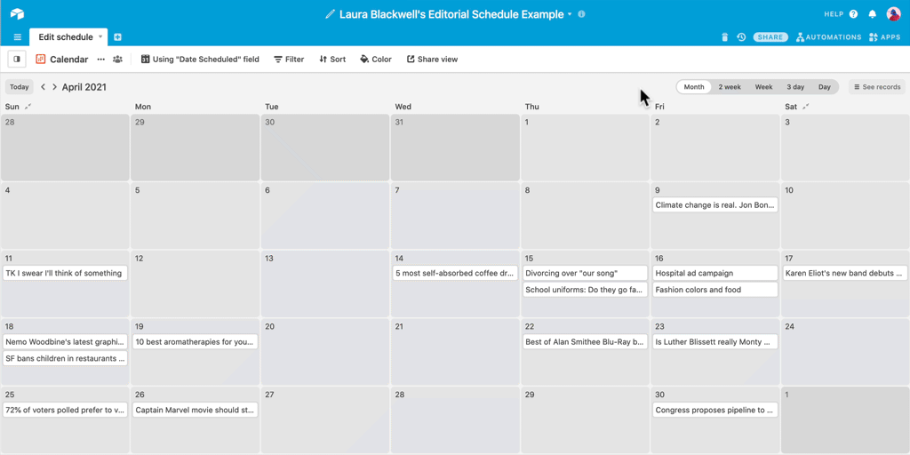 Calendar view makes it easy to change a story's publication date when you're inevitably forced to reschedule. It's as easy as dragging and dropping the record to a new date—and when you make these changes, you're actually changing the underlying data, so the scheduled date changes in every view simultaneously, for every person viewing the base.