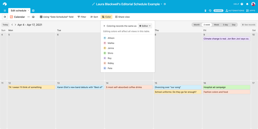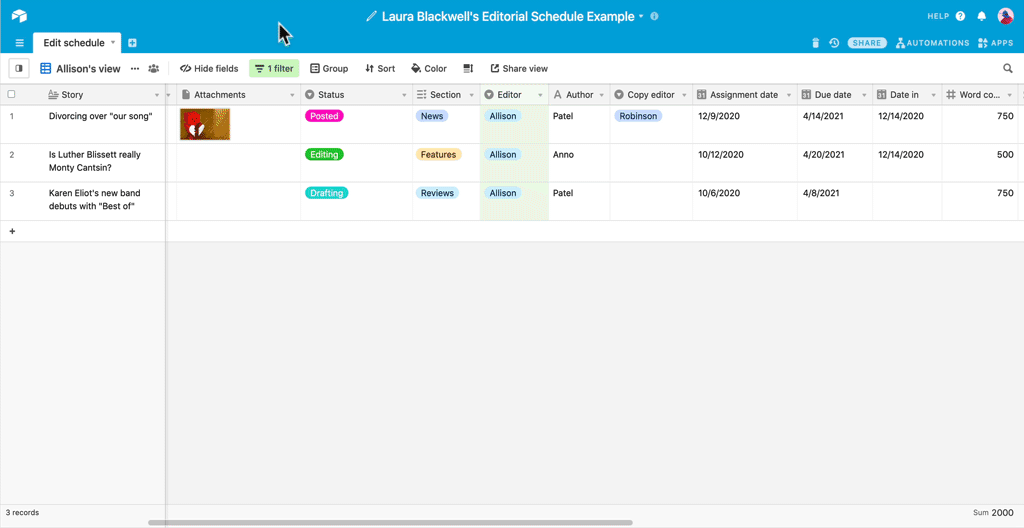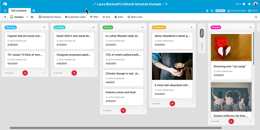 Laura Blackwell’s template demonstrates just one of many potential ways you could design an editorial calendar in Airtable. As mentioned previously, the best editorial calendar is one that incorporates the specific elements of your team’s processes and needs, so let’s walk through some of the ways you could adapt this template.