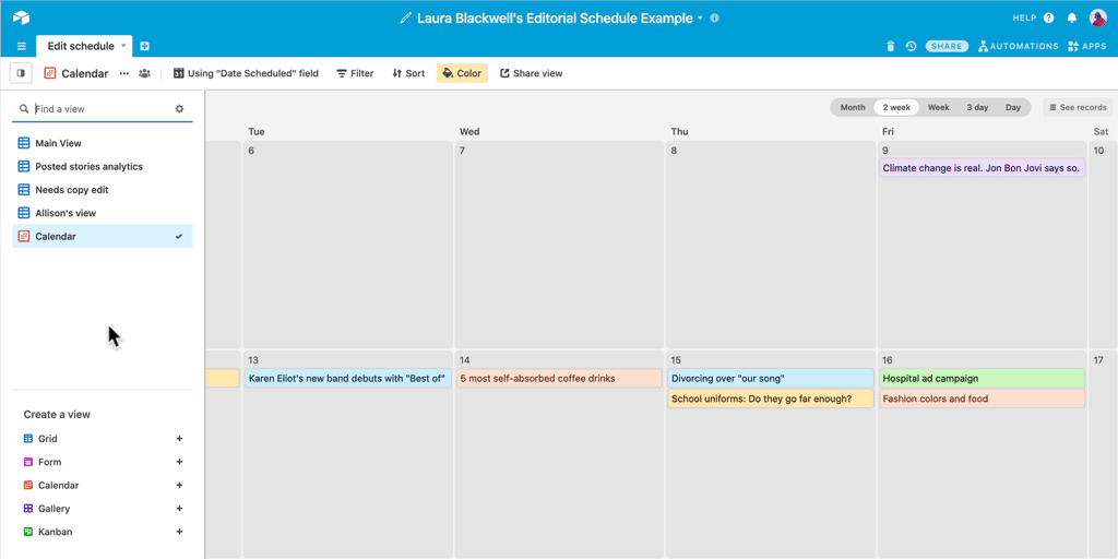 Blackwell’s template is just one way in which you could construct an editorial calendar in Airtable, but as you’ve seen, you can make any template your own by changing and adding your own field types, creating custom views, and more. Check out her template to see it for yourself—from there, you can make your own copy and edit it as you’d like.