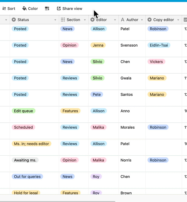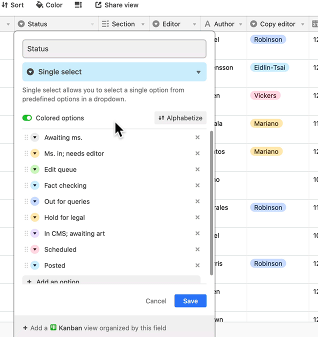 If you have project management-oriented teammates who like kanban boards, then try making a kanban view, in which your pieces are visualized as cards in stacks.