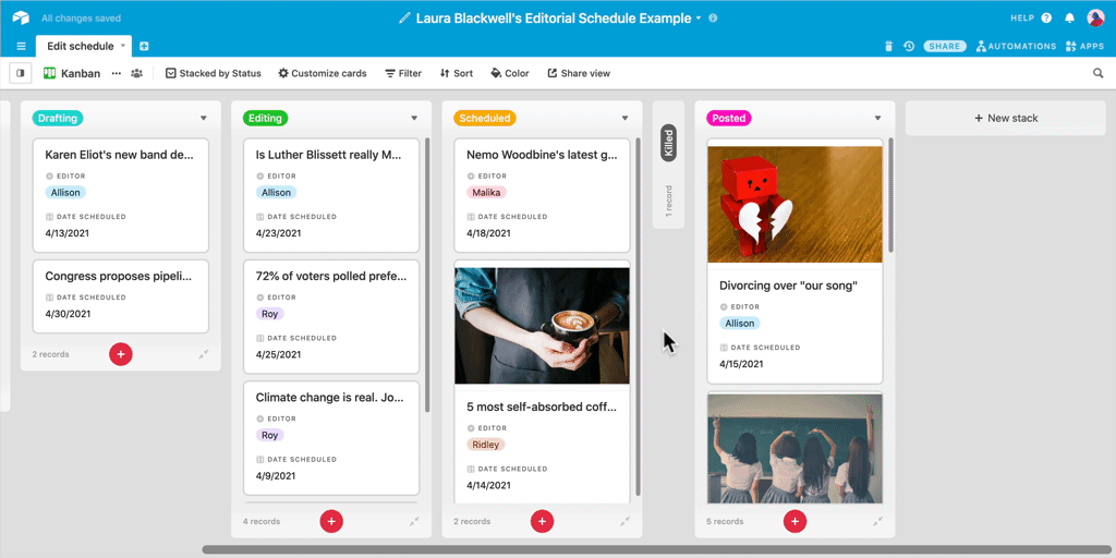 Similar to what happens if you click and drag records in calendar view, if you click and drag a kanban card from one stack to another, you’ll automatically update the status for that piece across the entire base.