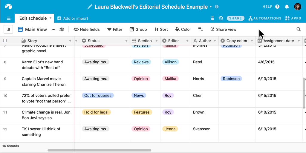 This base uses different field types (which appear as columns, in this spreadsheet-like grid view) to hold different types of information related to each story. Date fields can be used to coordinate scheduling, embargoes, and due dates; colorful single select fields allow you to track the current status of each story, mark the section to which a story belongs, or assign a copy editor.