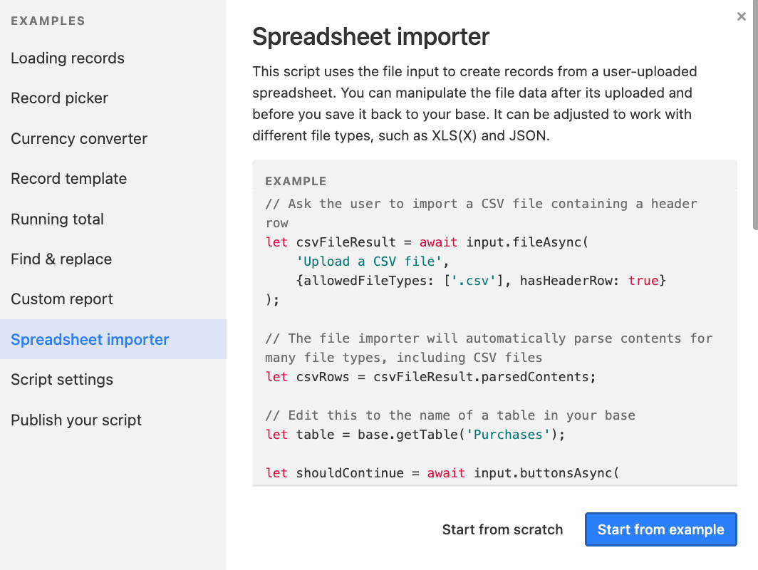 In an Airtable base, click the button to “add an app,” and choose Scripting. Once you’re there, you can choose from a list of common scripts, and either “Start from example” or “Start from scratch.”